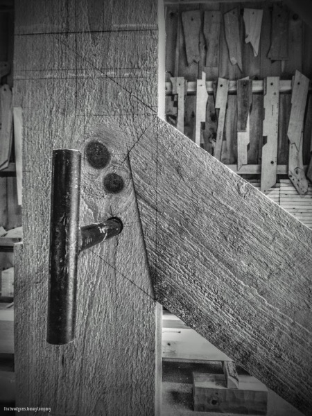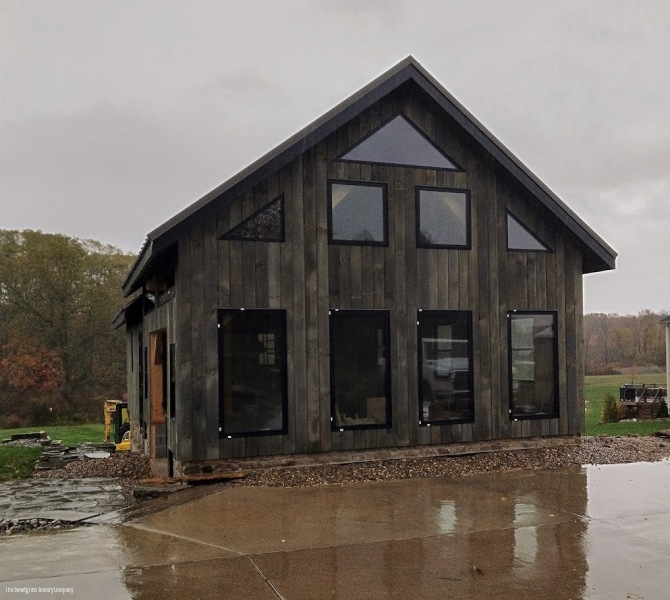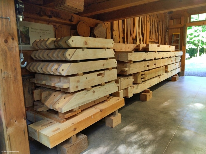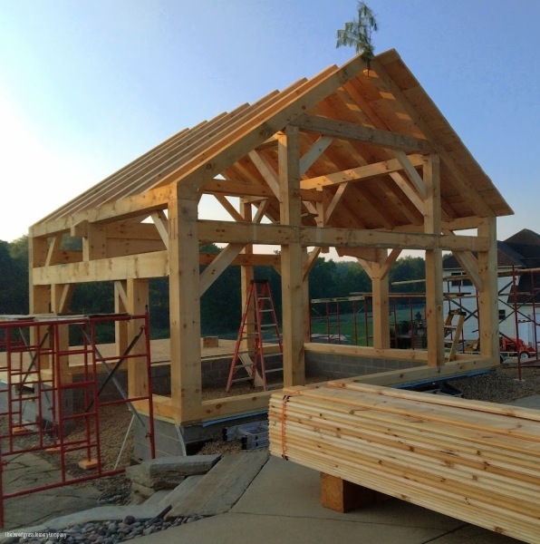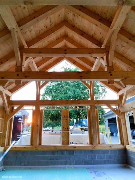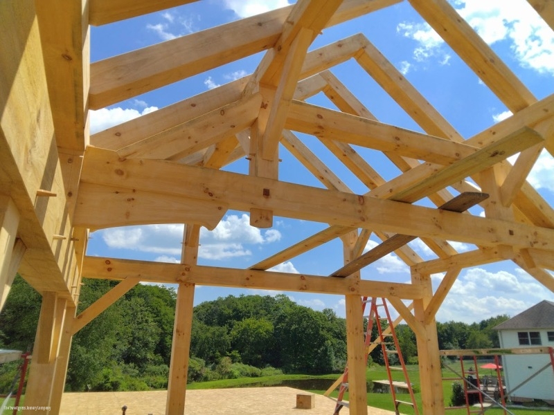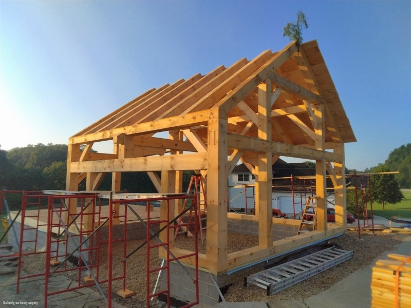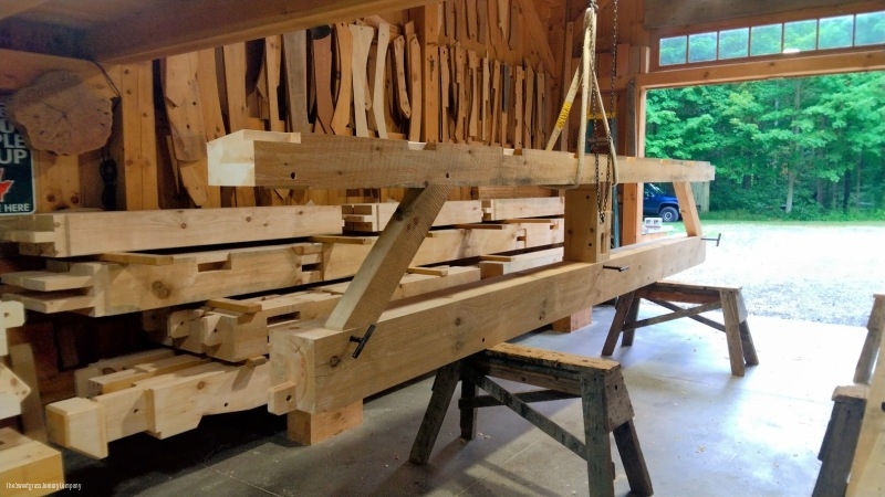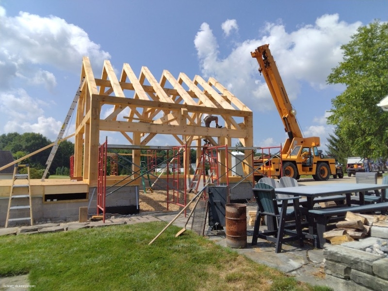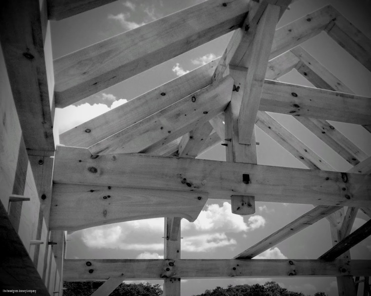 This 20′ x 20′ barn framework, crafted from local eastern white pine, comprises the timber-framed portion of a larger 20′ x 40 building that serves as a woodworking shop in the conventionally framed end and an enclosed pavilion for family gatherings and entertaining in the other end. The timber dimensions were sized intentionally larger than structurally necessary in order to create the barn-like aesthetic that the client often referenced during our initial design meetings. The frame design also utilizes a central queen-post truss that eliminates the need for any interior posts and allows for a set of large sliding doors to be located in the middle of the north eave-wall.